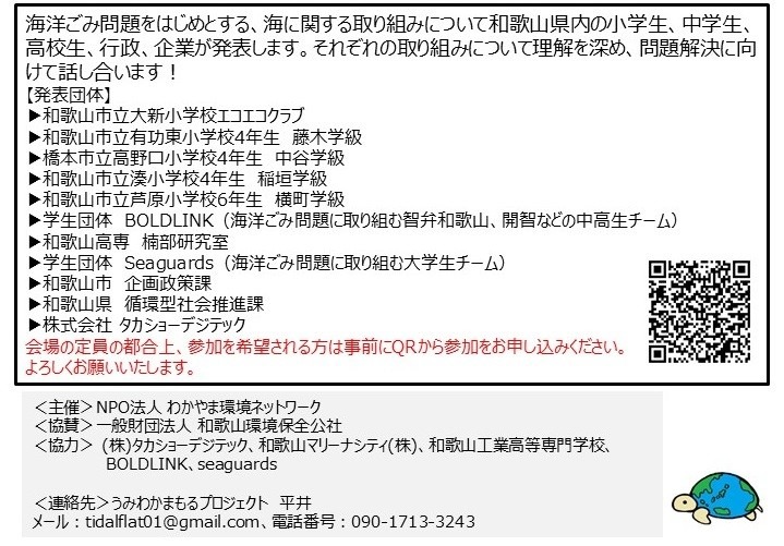 様々な海洋環境問題に対して理解を深め、持続可能な海社会を実現するために、今後どのような取り組みを実現していけばよいかをともに考える機会となるよう、海洋ごみ問題など海の環境に関する取組や研究等について、県内の小、中学生、高校生、企業、行政が発表するイベントを開催します。